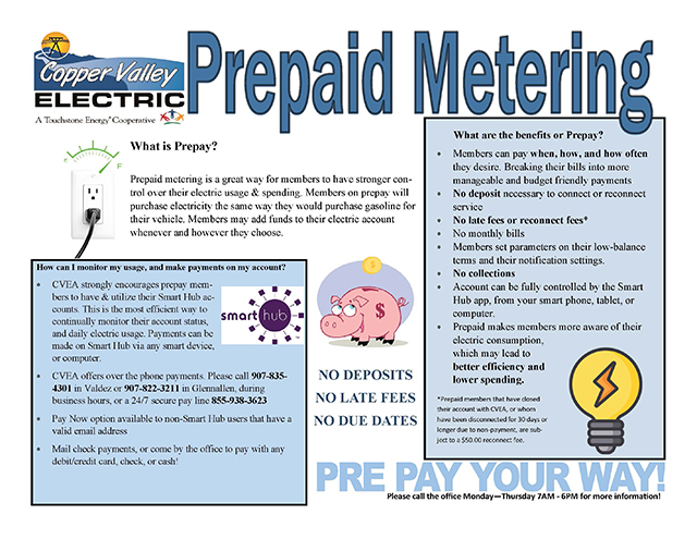 CVEA offers prepaid metering for residential members only, at the member’s request. Prepaid metering works the same way a member would purchase gasoline for their vehicles. When members sign up for prepay, they gain more control over their electric usage and their monthly utility spending.