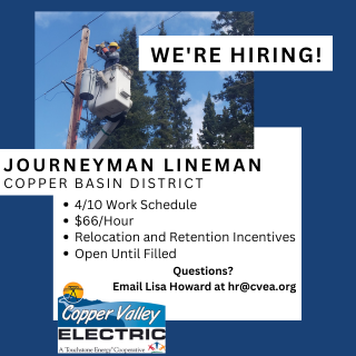 CVEA is a small electric cooperative, with roughly 45 employees, serving members in the Copper Basin and Valdez regions of Alaska. We offer a friendly, professional work environment, with competitive wages and an excellent benefits package.