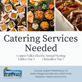 CVEA is seeking catering services for our upcoming Annual Meetings in Valdez and Glennallen. We invite local vendors to submit proposals to provide grab-and-go catering for these community events. Please click the link for proposal instructions.