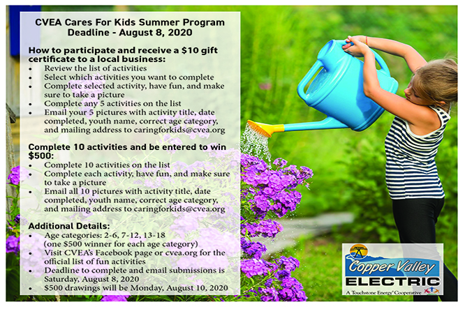 Copper Valley Electric would like to thank all the kiddos and families who participated in the CVEA Cares For Kids Summer Activity Program. In total, 153 kids between the age of 2 and 18 completed fun activities and earned local gift cards and a chance to win $500! It has been a JOY to see all of the fun and smiles these kids have shared with us. We hope they've enjoyed themselves and viewed this program as something positive during an otherwise challenging time.