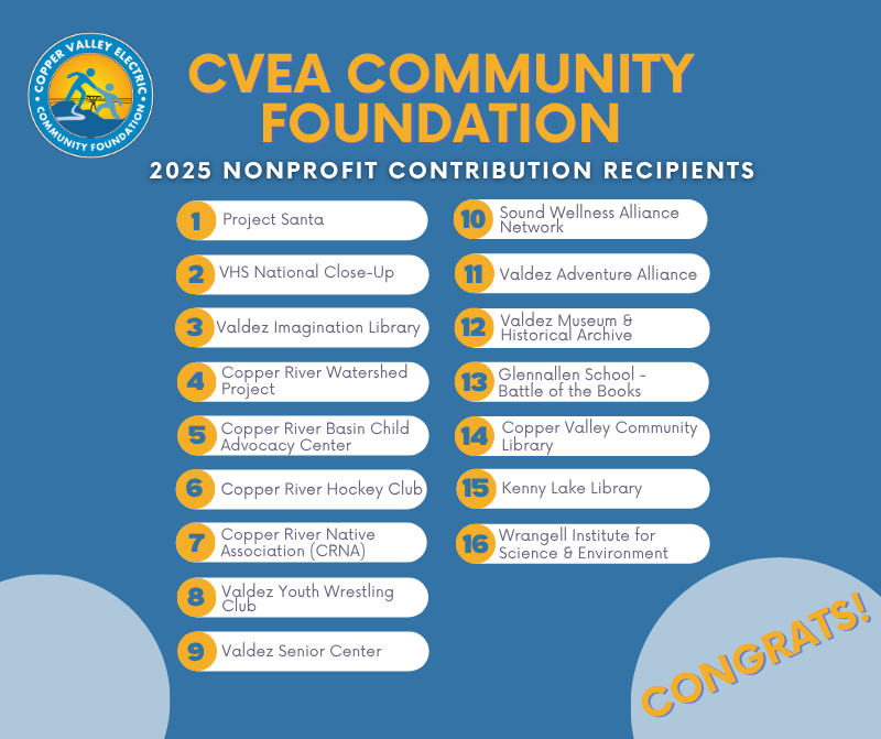 If you are a local nonprofit and interested in asking the CVEA Community Foundation for financial support, please review the CVEA Community Foundation contribution guidelines. If your organization, program or project qualifies for Community Foundation funds, complete an easy, fillable Contribution Request Form here. If you are not sure if you qualify, please email Morgan Melton, CVEA Chief Communications Officer at mmelton@cvea.org or call 907-822-3211. Local organizations who meet Foundation guidelines are encouraged to apply.