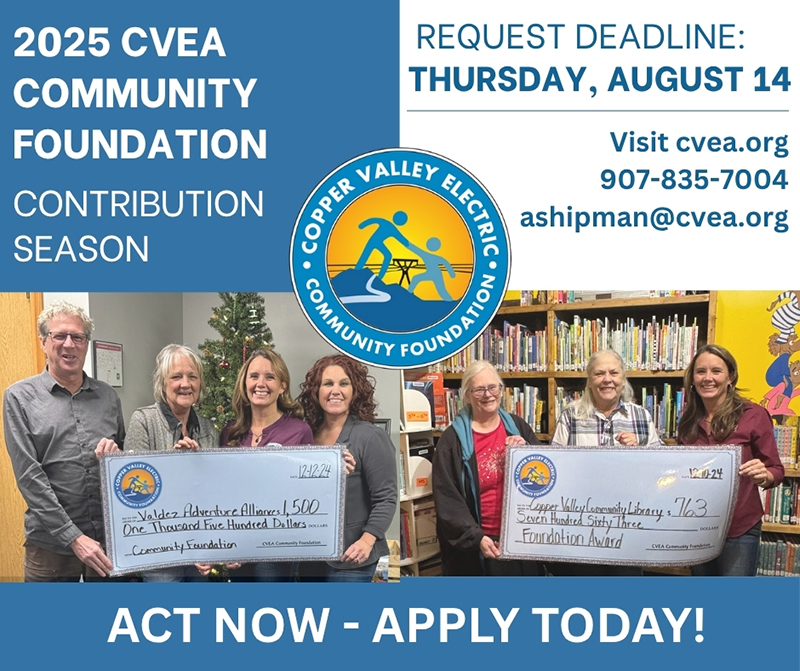 If you are a local non-profit and interested in asking the CVEA Community Foundation for financial support, please review the CVEA Community Foundation contribution guidelines. If your organization, program or project qualifies for Community Foundation funds, complete an easy, fillable Contribution Request Form here. If you are not sure if you qualify, please email Amanda Shipman, CVEA Marketing and Communications Specialist, at ashipman@cvea.org or call 907-822-3211.