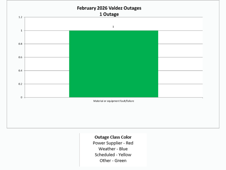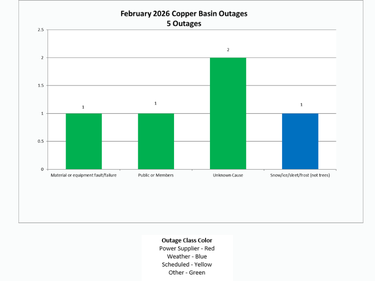 The graphs below show the number of outages for February 2026. They are organized by District, and by cause. These graphs will be updated each month to show the outages for that month.