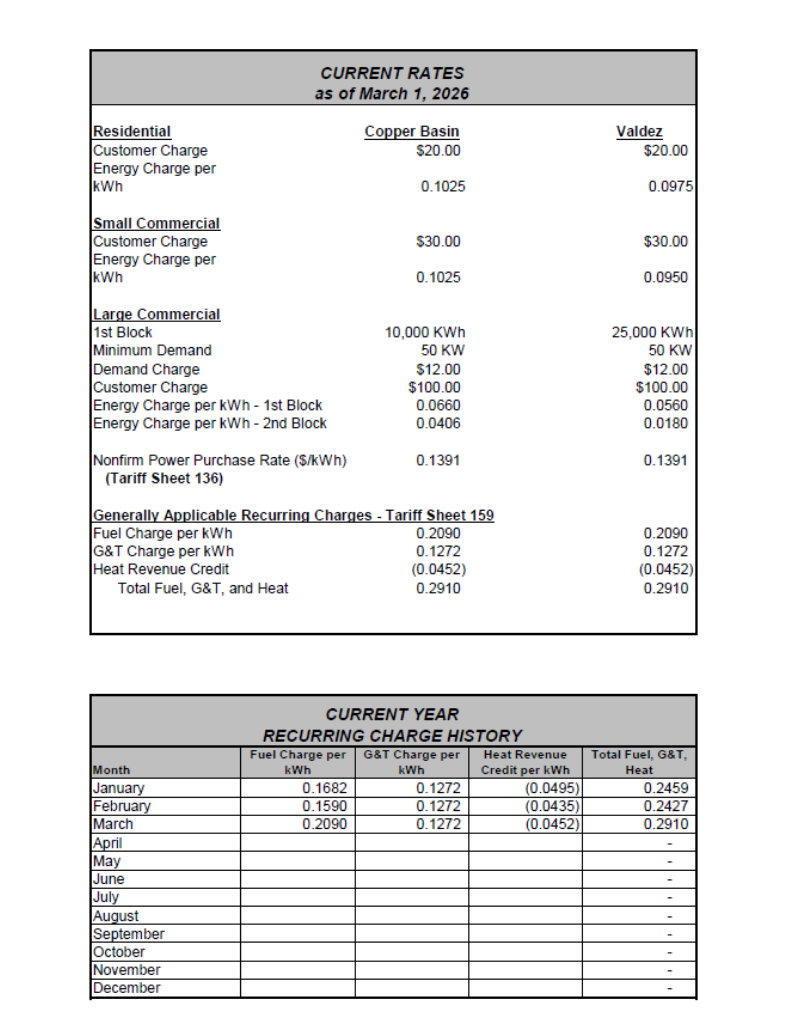 We recommend all prepaid members monitor their account balances diligently and maintain sufficient credit balances during this transition. For more information about rates, please contact the Copper Basin office at 907-822-3211, the Valdez office at 907-835-4301, or email customerservice@cvea.org.