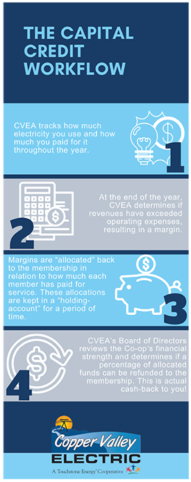 CVEA is a cooperative and operates on a not-for-profit basis. As a member of this multi-million dollar organization, you are also part owner. Electricity is provided at cost. Each year that revenue exceeds the cost to provide electric service (net margin), it is assigned to the individual member/owners in the form of capital credits. Capital credits represent the ownership each member has in the Association. The amount of capital credits assigned is in proportion to the amount billed for electric usage during that year.