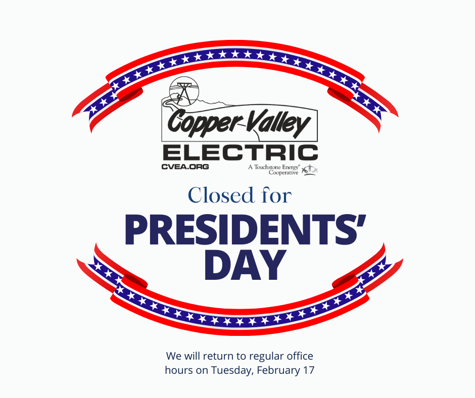 All CVEA offices will be closed on Monday, February 16, for Presidents' Day. If you experience an outage, please call Dispatch at 866-835-2832.
