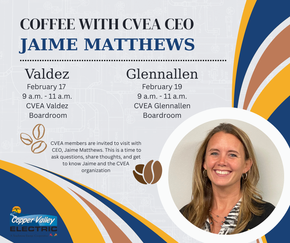 CVEA members are invited to visit with CEO Jaime Matthews for an informational conversation to share member ideas, questions, and concerns with CVEA leadership.
